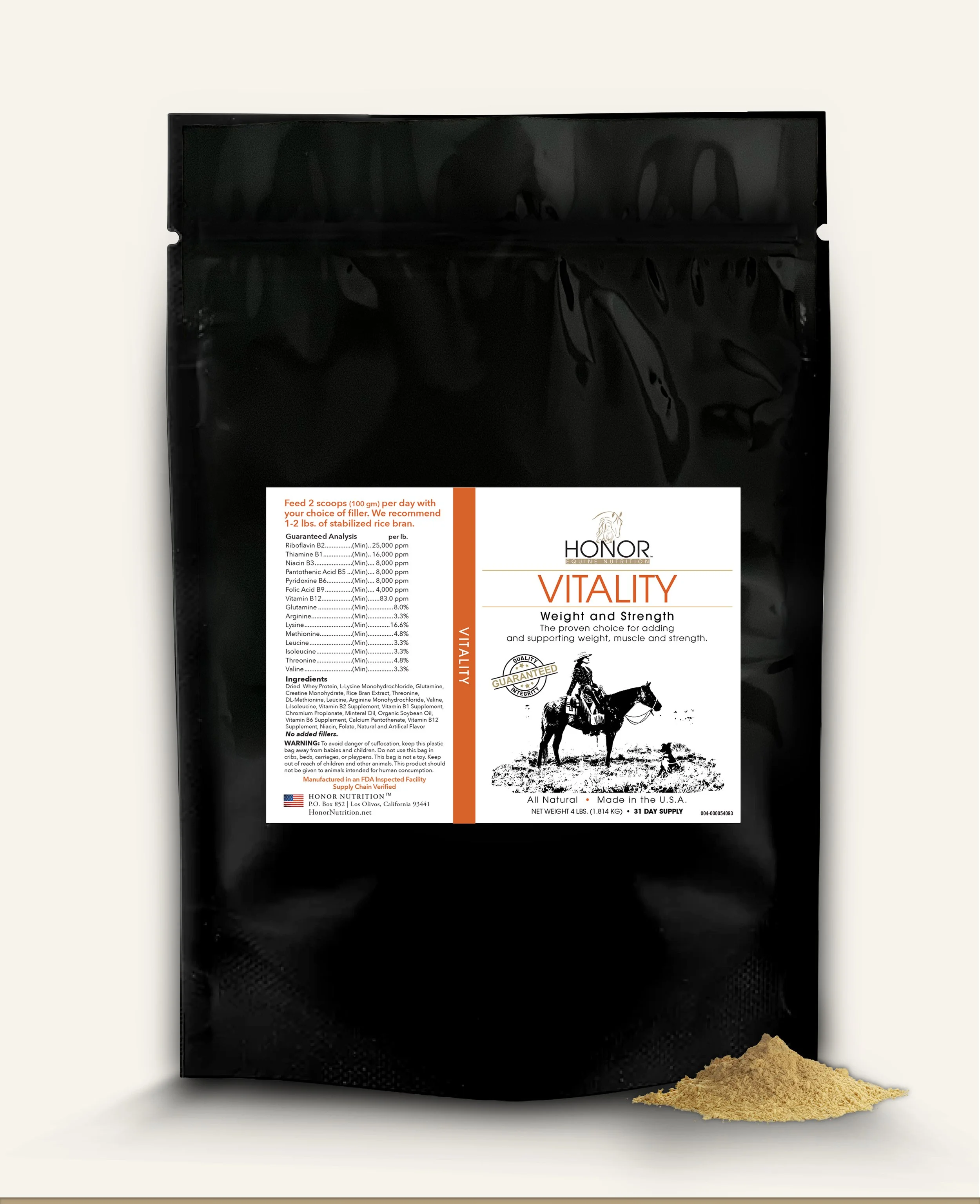 VITALITY promotes better utilization of nutrition and tests legal for all disciplines. It incorporates naturally occurring nutrients that are free of chemicals and synthetics so as to support the natural, athletic genetics rather than force the horse to work outside its own physical capacity. The result is reduced risk of injuries, improved muscle tone and top line, and increased strength and endurance. A top choice for fitting sale horses. -